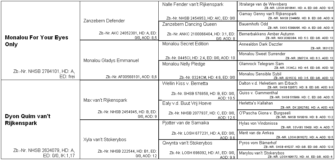 Mein Papa, Monalou For Your Eyes Only, genannt Finnley ist Engländer, meine Mama, Dyon Quim van 't Rijkenspark, ist Holländerin. Über meine Eltern könnt Ihr Euch natürlich auch ausführlich auf der Seite meiner Züchter informieren. Mein IK (Inzuchtkoeffizient) ist übringes 0,0, der AVK (Ahnenverlustkoeffizient) beträgt 88,71. :-)