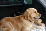 Auf Heikes Schoss wurde es mir schnell langweilig, habe ich doch einen anderen Hund im Auto erschnüffelt. Eine Goldie - Hündin, die war mit einer Bekannten meiner Menschin gekommen, um mich nach Hause zu begleiten. Sie sollte mir die lange Fahrt etwas angenehmer gestalten. Ihr Angebot habe ich gerne angenommen und habe mich nach den ersten 5 Minuten Fahrtzeit zu ihr nach hinten gelegt.
