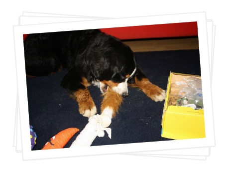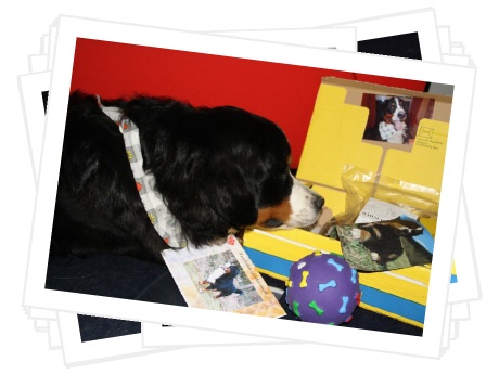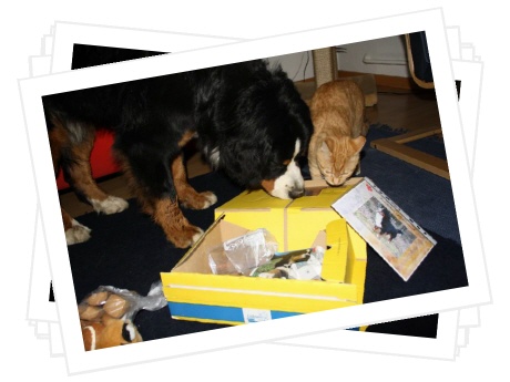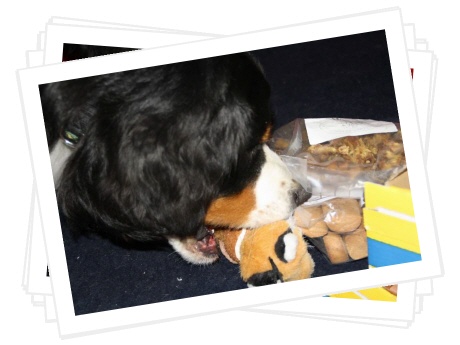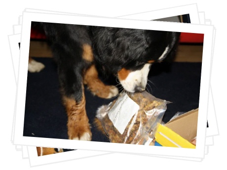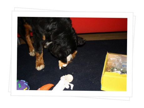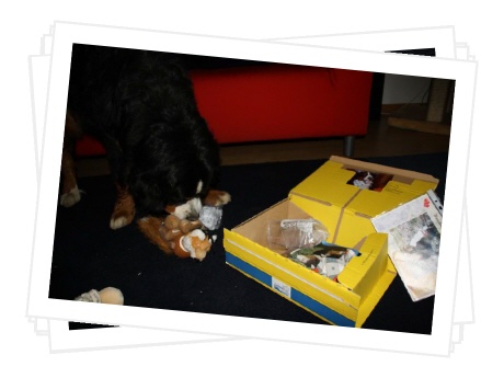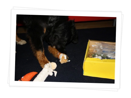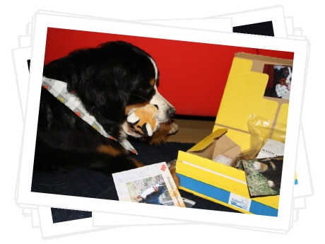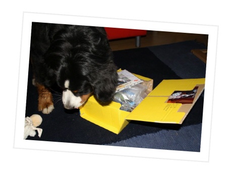 Das Paket musste ich immer wieder auf's Neue beschnüffeln, es hat nicht nur nach all den tollen Leckereien gerochen, nein, auch nach meinem Lover. :-) Ibbi hat mir u.a. ein Quitschespielzeug geschenkt, auch ein Halstuch war dabei, so können wir jetzt immer im Partnerlook rumlaufen. Cool, oder?