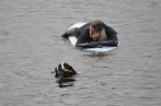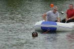 Im Folgenden könnt Ihr Euch anschauen, wie ich eine der Übungen aus dem B-Diplom absolviere, dazu springe ich vom Boot und apportiere die zuvor vom Boot *gefallene* Puppe, welche ich auch wieder zum Boot zurück bringe.