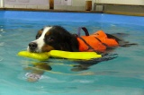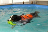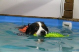 Ich habe dort eine Schwimmweste an die mir Auftrieb gibt, das Wasser hat 28°C, und es geht immer eine der netten Physiotherapeutinnen mit ins Wasser. Sie wirft mir entweder meinen Kurt, das Kroki oder ein anderes Spielzeug, welches ich dann rette. :-)
